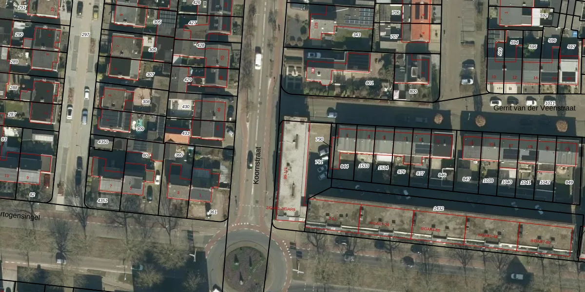 Het perceel waarop Koornstraat 111 staat heeft een oppervlakte van 603 m². Dit is een groot perceel. De perceeloppervlakte wordt geregistreerd door het Kadaster. Gedetailleerde informatie over de maten van dit perceel kunt u vinden in het rapport Kadastrale kaart met maatvoering van Koornstraat 111.