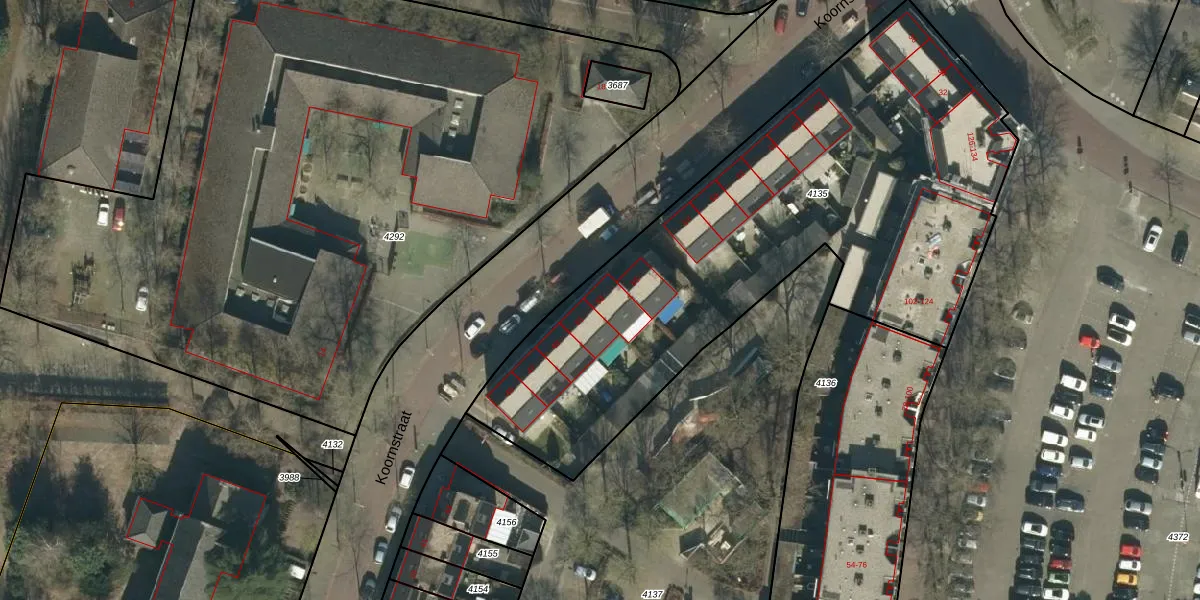 Het perceel waarop Koornstraat 53 staat heeft een oppervlakte van 2815 m². Dit is een zeer groot perceel. De perceeloppervlakte wordt geregistreerd door het Kadaster. Gedetailleerde informatie over de maten van dit perceel kunt u vinden in het rapport Kadastrale kaart met maatvoering van Koornstraat 53.