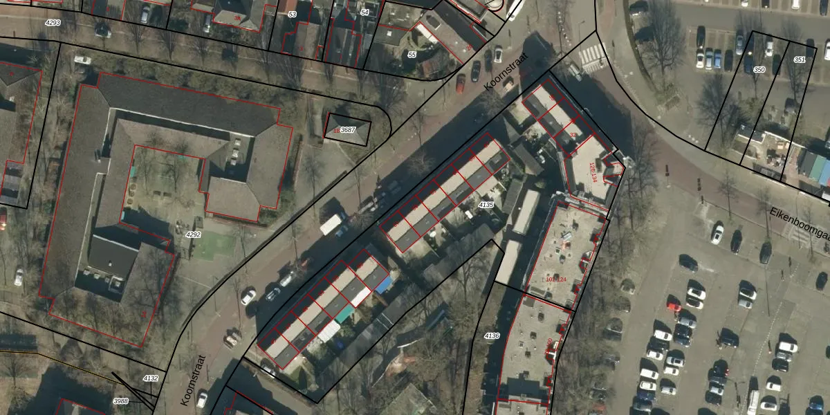 Het perceel waarop Koornstraat 59 staat heeft een oppervlakte van 2815 m². Dit is een zeer groot perceel. De perceeloppervlakte wordt geregistreerd door het Kadaster. Gedetailleerde informatie over de maten van dit perceel kunt u vinden in het rapport Kadastrale kaart met maatvoering van Koornstraat 59.