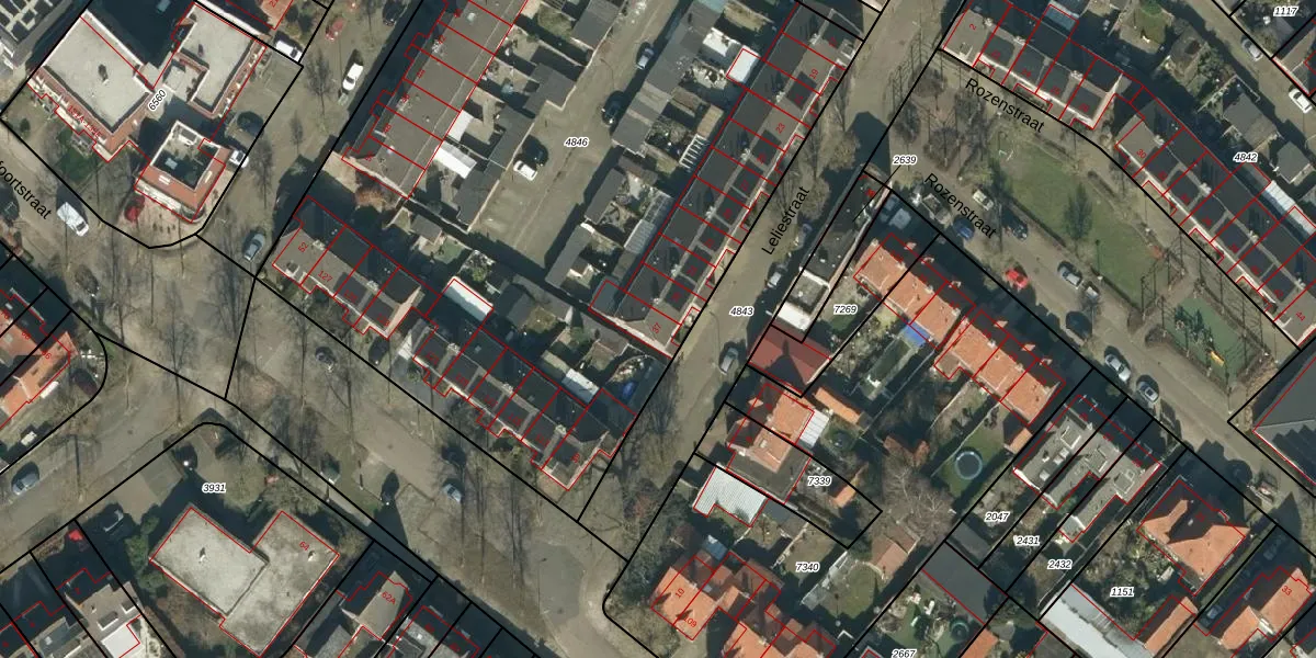 Het perceel waarop Leliestraat 37 staat heeft een oppervlakte van 4969 m². Dit is een zeer groot perceel. De perceeloppervlakte wordt geregistreerd door het Kadaster. Gedetailleerde informatie over de maten van dit perceel kunt u vinden in het rapport Kadastrale kaart met maatvoering van Leliestraat 37.