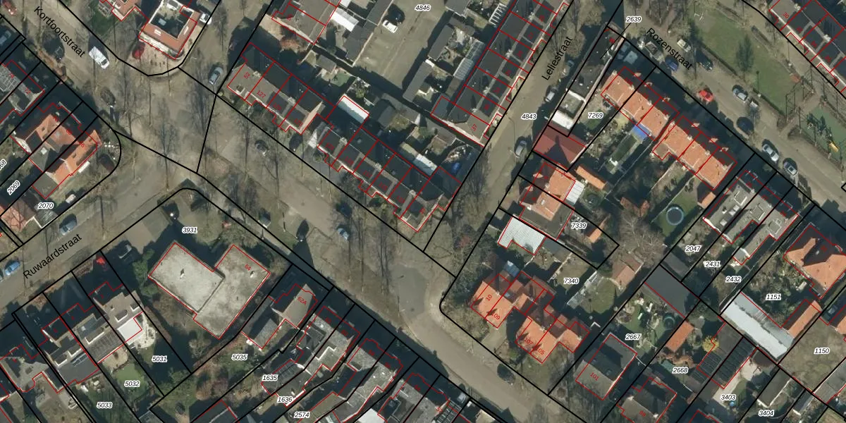 Het perceel waarop Leliestraat 39 staat heeft een oppervlakte van 4969 m². Dit is een zeer groot perceel. De perceeloppervlakte wordt geregistreerd door het Kadaster. Gedetailleerde informatie over de maten van dit perceel kunt u vinden in het rapport Kadastrale kaart met maatvoering van Leliestraat 39.