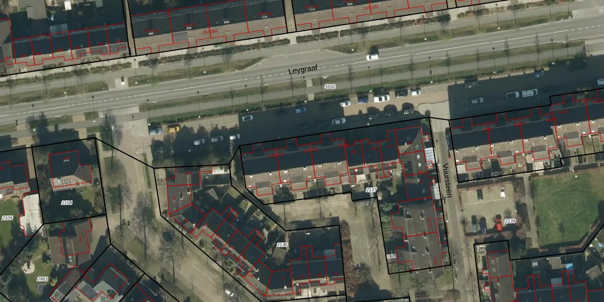 Het perceel waarop Leygraaf 100 staat heeft een oppervlakte van 1915 m². Dit is een zeer groot perceel. De perceeloppervlakte wordt geregistreerd door het Kadaster. Gedetailleerde informatie over de maten van dit perceel kunt u vinden in het rapport Kadastrale kaart met maatvoering van Leygraaf 100.