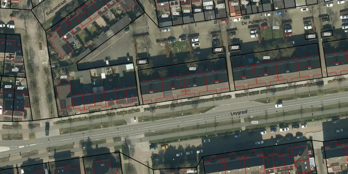 Leygraaf 265 is gelegen op kadastraal perceel OSS00K2596. Deze kadastrale aanduiding is uniek en wordt gebruikt door het Kadaster om eigendomsrechten en andere zakelijke rechten vast te leggen. Het perceel maakt onderdeel uit van de kadastrale gemeente Oss.