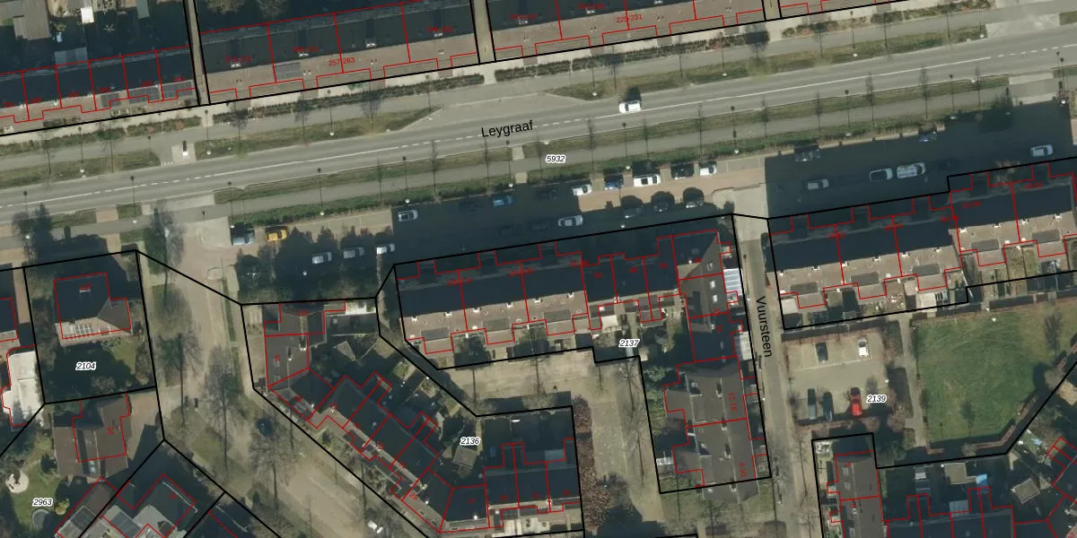 Het perceel waarop Leygraaf 98 staat heeft een oppervlakte van 1915 m². Dit is een zeer groot perceel. De perceeloppervlakte wordt geregistreerd door het Kadaster. Gedetailleerde informatie over de maten van dit perceel kunt u vinden in het rapport Kadastrale kaart met maatvoering van Leygraaf 98.