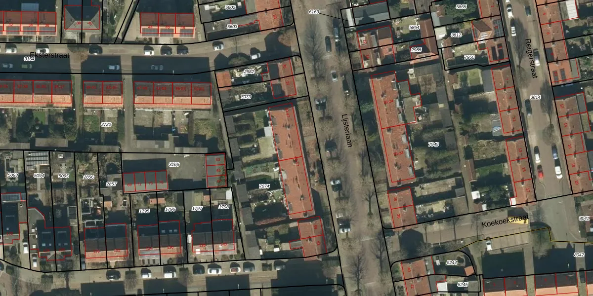 Het perceel waarop Lijsterlaan 45 staat heeft een oppervlakte van 1621 m². Dit is een zeer groot perceel. De perceeloppervlakte wordt geregistreerd door het Kadaster. Gedetailleerde informatie over de maten van dit perceel kunt u vinden in het rapport Kadastrale kaart met maatvoering van Lijsterlaan 45.