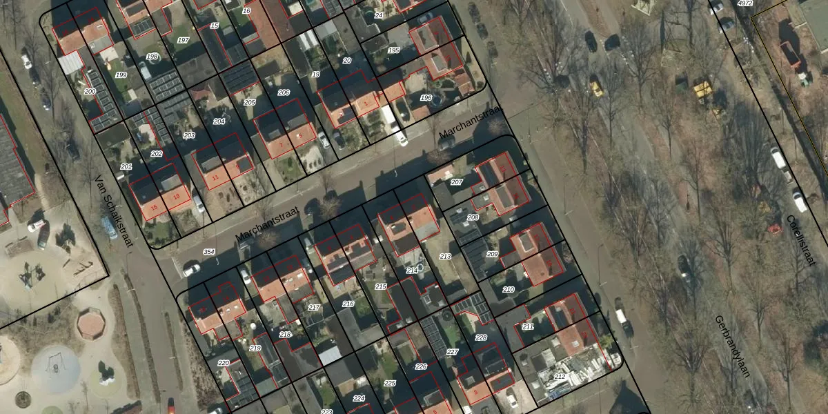 Het perceel waarop Marchantstraat 2 staat heeft een oppervlakte van 267 m². Dit is een middelgroot perceel. De perceeloppervlakte wordt geregistreerd door het Kadaster. Gedetailleerde informatie over de maten van dit perceel kunt u vinden in het rapport Kadastrale kaart met maatvoering van Marchantstraat 2.