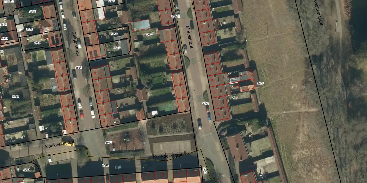 Het perceel waarop Merelstraat 15 staat heeft een oppervlakte van 3044 m². Dit is een zeer groot perceel. De perceeloppervlakte wordt geregistreerd door het Kadaster. Gedetailleerde informatie over de maten van dit perceel kunt u vinden in het rapport Kadastrale kaart met maatvoering van Merelstraat 15.