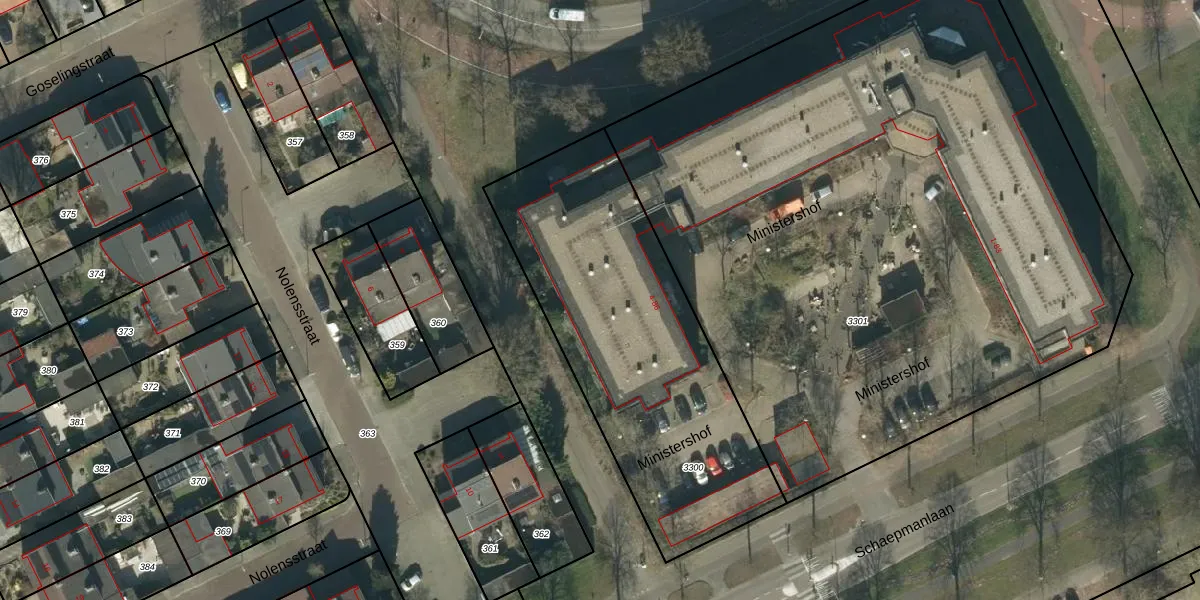 Het perceel waarop Ministershof 46 staat heeft een oppervlakte van 1564 m². Dit is een zeer groot perceel. De perceeloppervlakte wordt geregistreerd door het Kadaster. Gedetailleerde informatie over de maten van dit perceel kunt u vinden in het rapport Kadastrale kaart met maatvoering van Ministershof 46.