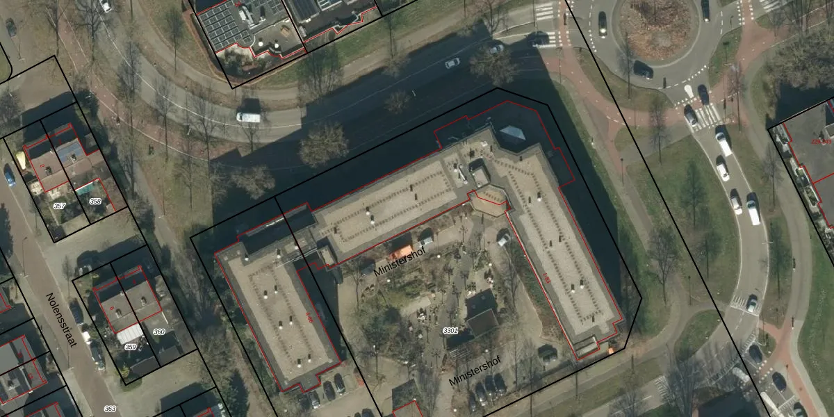 Het perceel waarop Ministershof 83 staat heeft een oppervlakte van 4681 m². Dit is een zeer groot perceel. De perceeloppervlakte wordt geregistreerd door het Kadaster. Gedetailleerde informatie over de maten van dit perceel kunt u vinden in het rapport Kadastrale kaart met maatvoering van Ministershof 83.