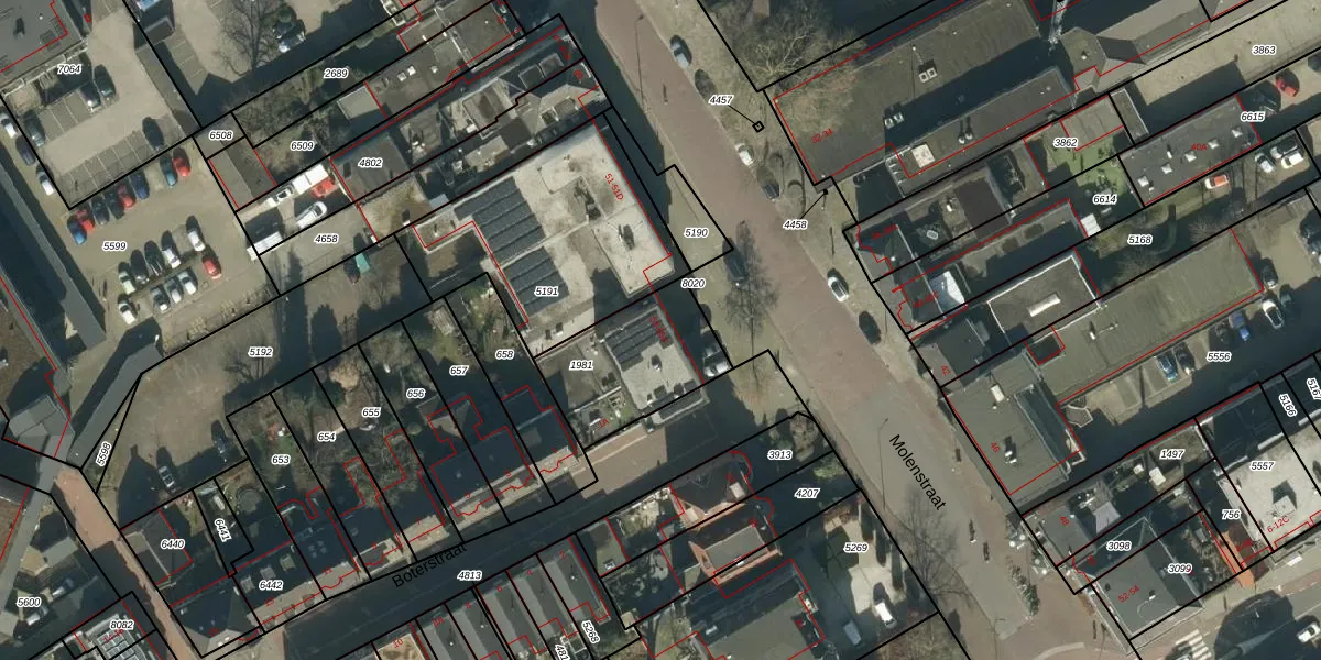 Het perceel waarop Molenstraat 55 staat heeft een oppervlakte van 420 m². Dit is een groot perceel. De perceeloppervlakte wordt geregistreerd door het Kadaster. Gedetailleerde informatie over de maten van dit perceel kunt u vinden in het rapport Kadastrale kaart met maatvoering van Molenstraat 55.