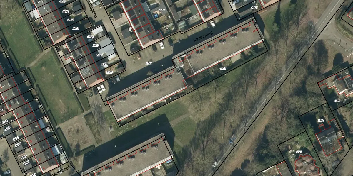 Het perceel waarop Mollegang 46 staat heeft een oppervlakte van 1751 m². Dit is een zeer groot perceel. De perceeloppervlakte wordt geregistreerd door het Kadaster. Gedetailleerde informatie over de maten van dit perceel kunt u vinden in het rapport Kadastrale kaart met maatvoering van Mollegang 46.