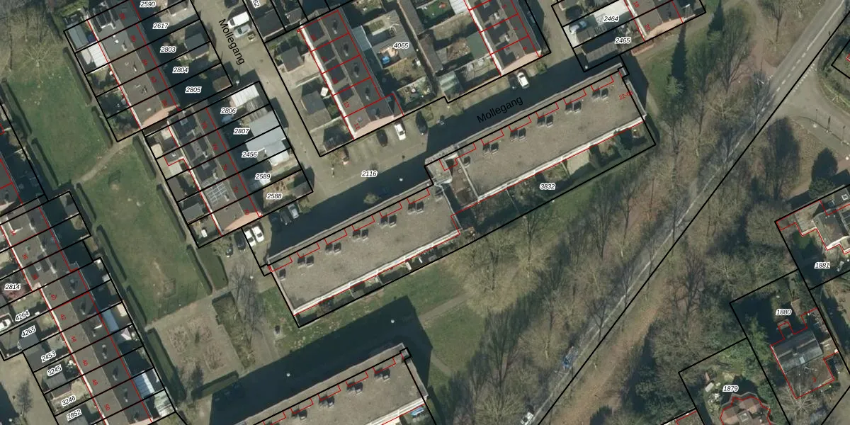 Het perceel waarop Mollegang 58 staat heeft een oppervlakte van 1751 m². Dit is een zeer groot perceel. De perceeloppervlakte wordt geregistreerd door het Kadaster. Gedetailleerde informatie over de maten van dit perceel kunt u vinden in het rapport Kadastrale kaart met maatvoering van Mollegang 58.
