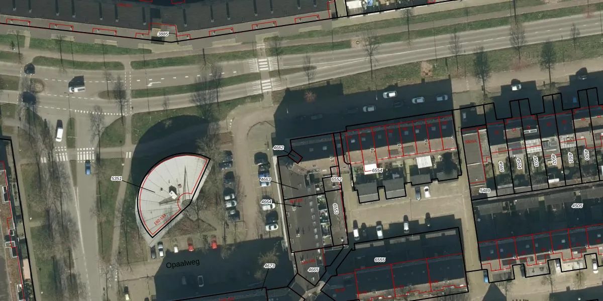 Opaalweg 102 is gelegen op kadastraal perceel OSS00E4663. Deze kadastrale aanduiding is uniek en wordt gebruikt door het Kadaster om eigendomsrechten en andere zakelijke rechten vast te leggen. Het perceel maakt onderdeel uit van de kadastrale gemeente Oss.