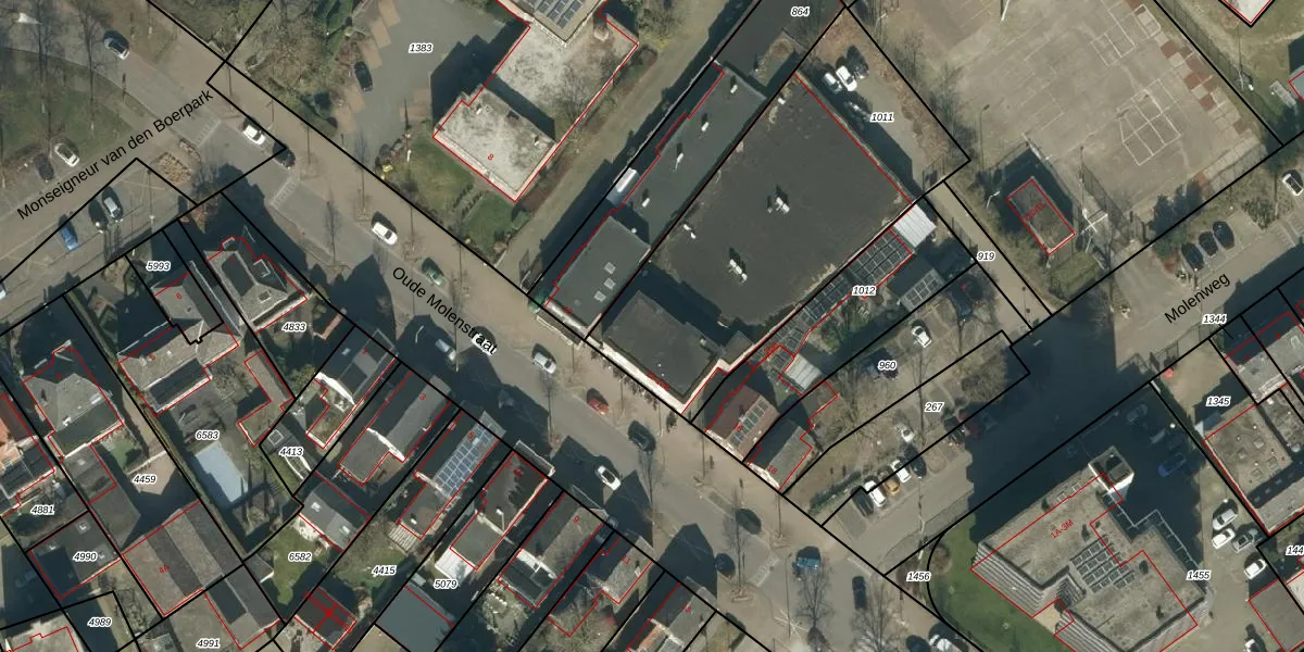Het perceel waarop Oude Molenstraat 12-A staat heeft een oppervlakte van 1490 m². Dit is een zeer groot perceel. De perceeloppervlakte wordt geregistreerd door het Kadaster. Gedetailleerde informatie over de maten van dit perceel kunt u vinden in het rapport Kadastrale kaart met maatvoering van Oude Molenstraat 12-A.