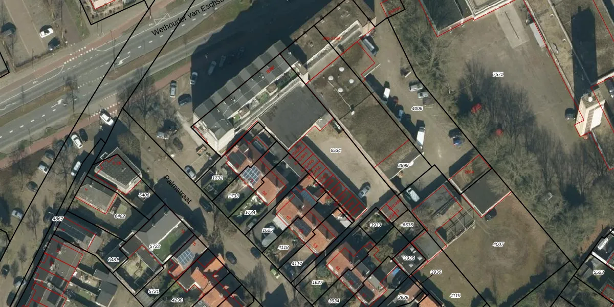 Het perceel waarop Palmstraat 61-GAR4 staat heeft een oppervlakte van 1427 m². Dit is een zeer groot perceel. De perceeloppervlakte wordt geregistreerd door het Kadaster. Gedetailleerde informatie over de maten van dit perceel kunt u vinden in het rapport Kadastrale kaart met maatvoering van Palmstraat 61-GAR4.