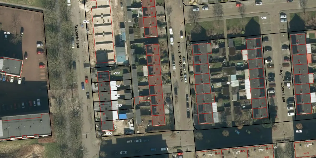 Het perceel waarop Philips de Goedestraat 14 staat heeft een oppervlakte van 5659 m². Dit is een zeer groot perceel. De perceeloppervlakte wordt geregistreerd door het Kadaster. Gedetailleerde informatie over de maten van dit perceel kunt u vinden in het rapport Kadastrale kaart met maatvoering van Philips de Goedestraat 14.