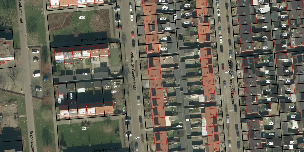 Het perceel waarop Philips de Goedestraat 39 staat heeft een oppervlakte van 6353 m². Dit is een zeer groot perceel. De perceeloppervlakte wordt geregistreerd door het Kadaster. Gedetailleerde informatie over de maten van dit perceel kunt u vinden in het rapport Kadastrale kaart met maatvoering van Philips de Goedestraat 39.