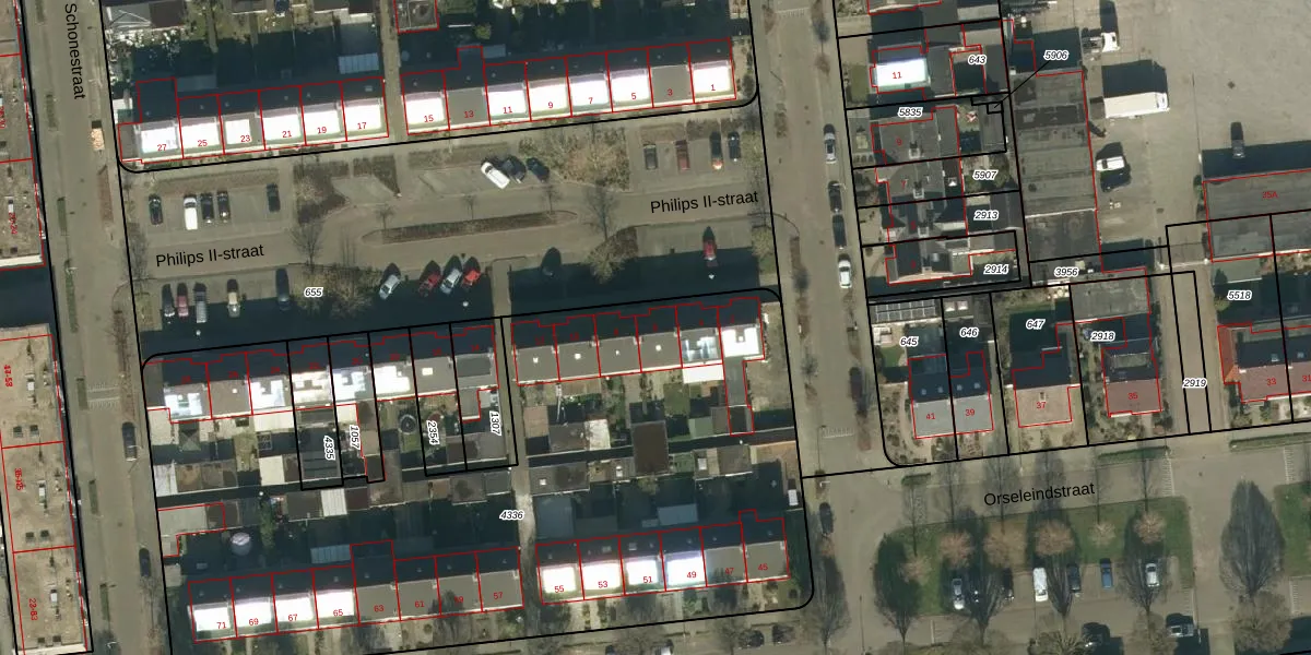 Het perceel waarop Philips II-straat 6 staat heeft een oppervlakte van 4215 m². Dit is een zeer groot perceel. De perceeloppervlakte wordt geregistreerd door het Kadaster. Gedetailleerde informatie over de maten van dit perceel kunt u vinden in het rapport Kadastrale kaart met maatvoering van Philips II-straat 6.