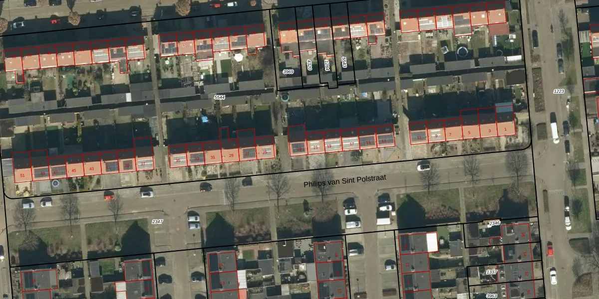 Het perceel waarop Philips van Sint Polstraat 23 staat heeft een oppervlakte van 8946 m². Dit is een zeer groot perceel. De perceeloppervlakte wordt geregistreerd door het Kadaster. Gedetailleerde informatie over de maten van dit perceel kunt u vinden in het rapport Kadastrale kaart met maatvoering van Philips van Sint Polstraat 23.