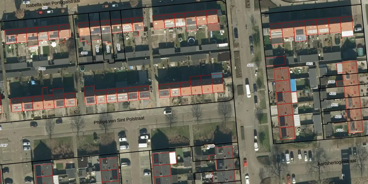 Het perceel waarop Philips van Sint Polstraat 7 staat heeft een oppervlakte van 8946 m². Dit is een zeer groot perceel. De perceeloppervlakte wordt geregistreerd door het Kadaster. Gedetailleerde informatie over de maten van dit perceel kunt u vinden in het rapport Kadastrale kaart met maatvoering van Philips van Sint Polstraat 7.