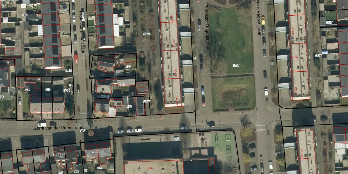 Het perceel waarop Professor Regoutstraat 126 staat heeft een oppervlakte van 4336 m². Dit is een zeer groot perceel. De perceeloppervlakte wordt geregistreerd door het Kadaster. Gedetailleerde informatie over de maten van dit perceel kunt u vinden in het rapport Kadastrale kaart met maatvoering van Professor Regoutstraat 126.