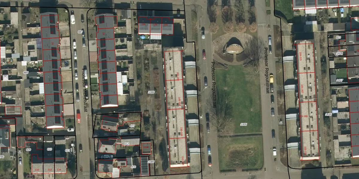 Het perceel waarop Professor Regoutstraat 164 staat heeft een oppervlakte van 4336 m². Dit is een zeer groot perceel. De perceeloppervlakte wordt geregistreerd door het Kadaster. Gedetailleerde informatie over de maten van dit perceel kunt u vinden in het rapport Kadastrale kaart met maatvoering van Professor Regoutstraat 164.