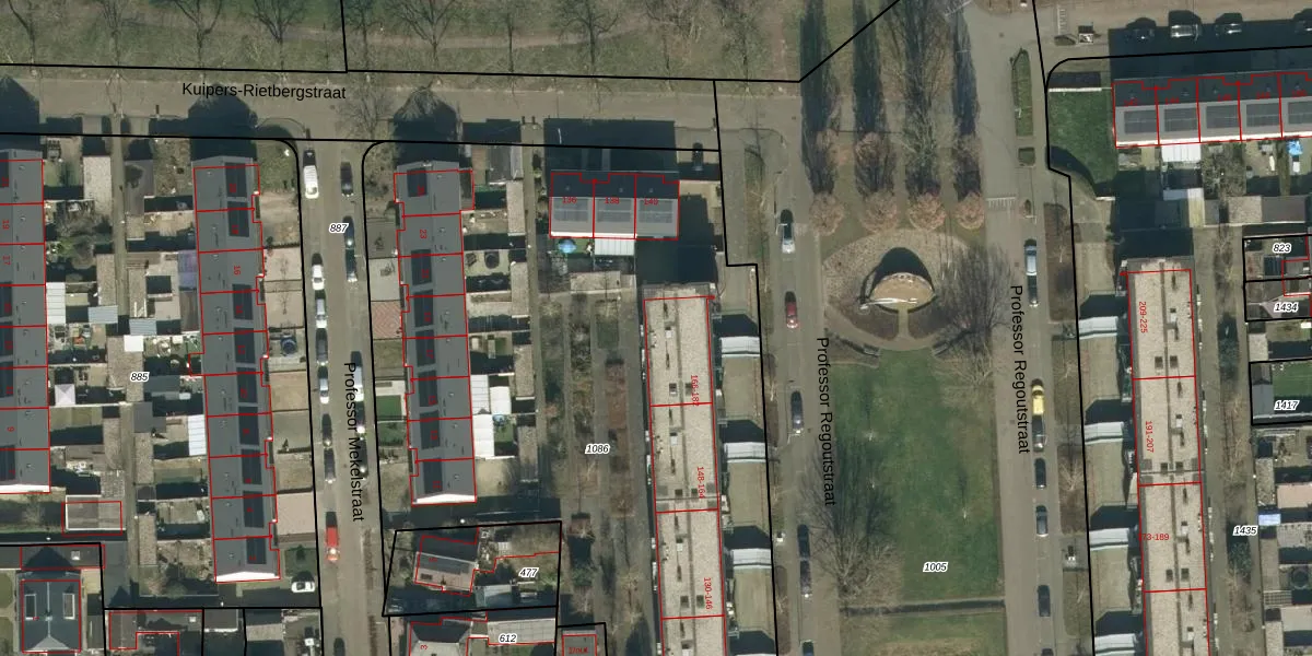 Het perceel waarop Professor Regoutstraat 176 staat heeft een oppervlakte van 4336 m². Dit is een zeer groot perceel. De perceeloppervlakte wordt geregistreerd door het Kadaster. Gedetailleerde informatie over de maten van dit perceel kunt u vinden in het rapport Kadastrale kaart met maatvoering van Professor Regoutstraat 176.