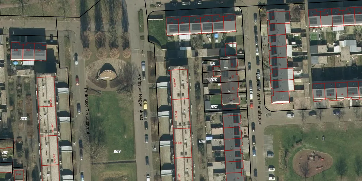 Het perceel waarop Professor Regoutstraat 213 staat heeft een oppervlakte van 4579 m². Dit is een zeer groot perceel. De perceeloppervlakte wordt geregistreerd door het Kadaster. Gedetailleerde informatie over de maten van dit perceel kunt u vinden in het rapport Kadastrale kaart met maatvoering van Professor Regoutstraat 213.