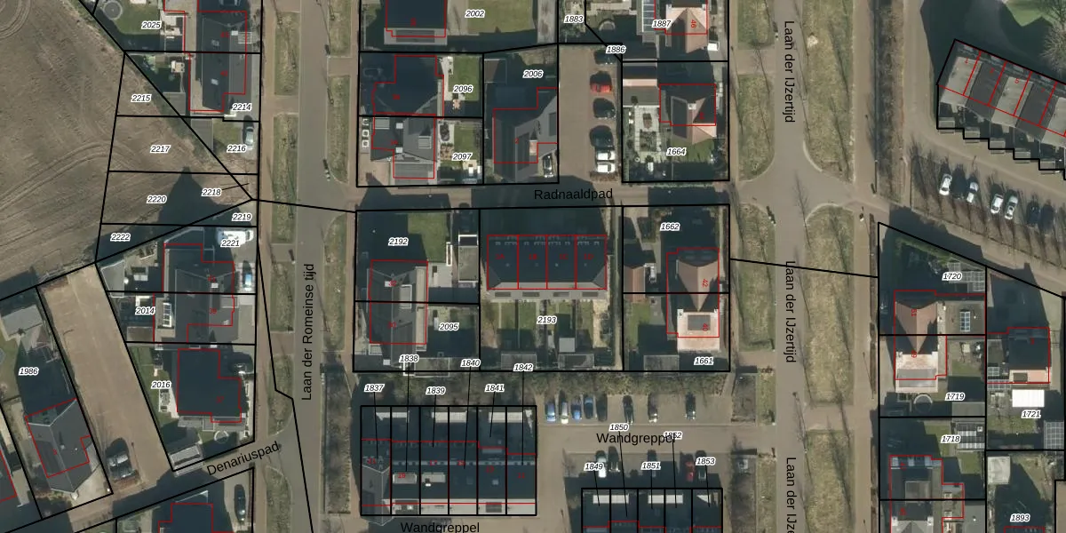Radnaaldpad 1-B is gelegen op kadastraal perceel OSS00H2193. Deze kadastrale aanduiding is uniek en wordt gebruikt door het Kadaster om eigendomsrechten en andere zakelijke rechten vast te leggen. Het perceel maakt onderdeel uit van de kadastrale gemeente Oss.