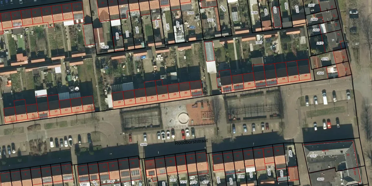 Roodborststraat 30 is gelegen op kadastraal perceel OSS00E7897. Deze kadastrale aanduiding is uniek en wordt gebruikt door het Kadaster om eigendomsrechten en andere zakelijke rechten vast te leggen. Het perceel maakt onderdeel uit van de kadastrale gemeente Oss.