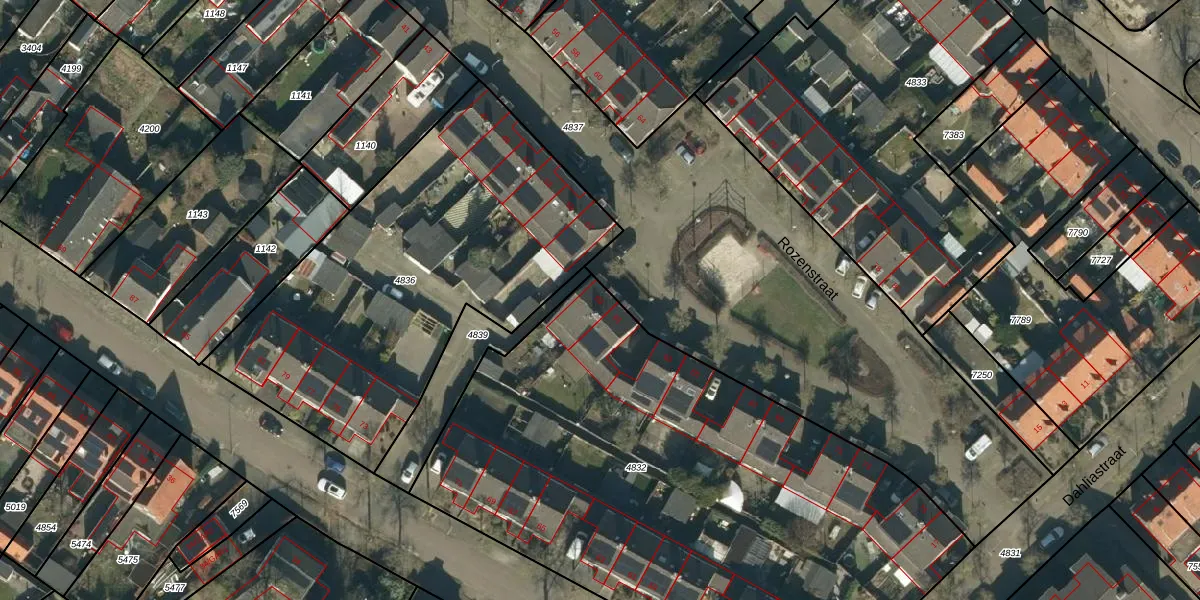 Het perceel waarop Rozenstraat 59 staat heeft een oppervlakte van 3427 m². Dit is een zeer groot perceel. De perceeloppervlakte wordt geregistreerd door het Kadaster. Gedetailleerde informatie over de maten van dit perceel kunt u vinden in het rapport Kadastrale kaart met maatvoering van Rozenstraat 59.