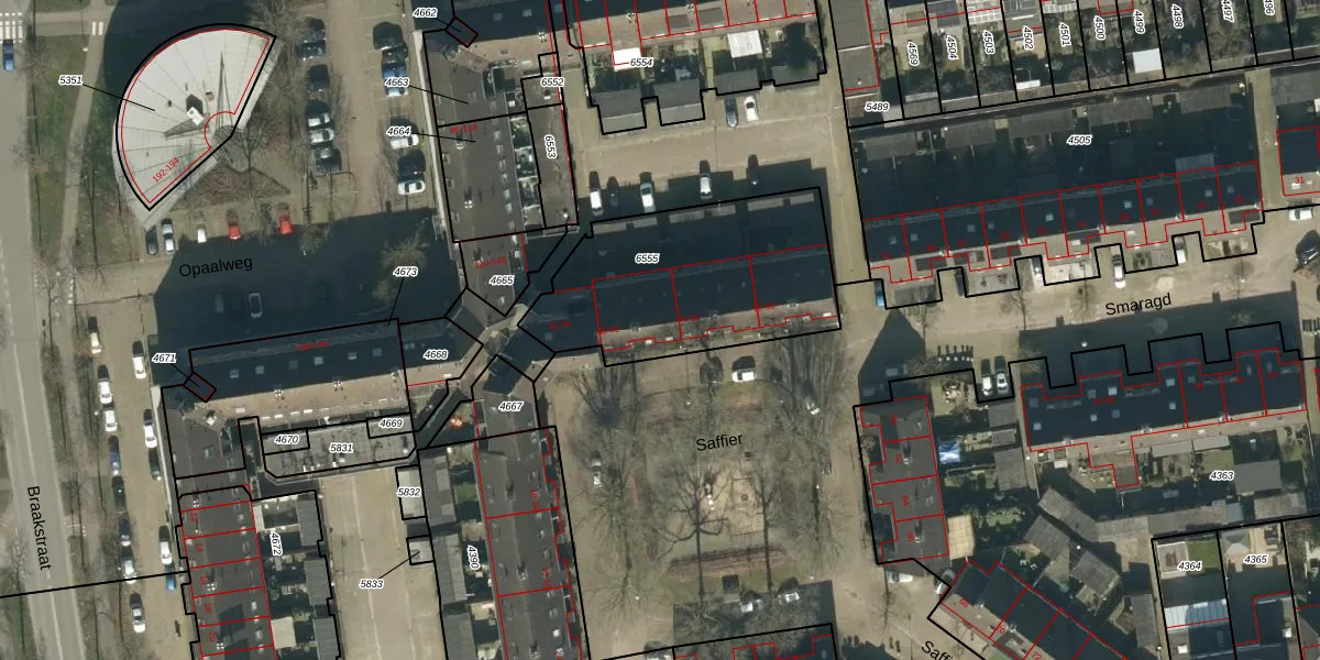 Het perceel waarop Saffier 40 staat heeft een oppervlakte van 889 m². Dit is een groot perceel. De perceeloppervlakte wordt geregistreerd door het Kadaster. Gedetailleerde informatie over de maten van dit perceel kunt u vinden in het rapport Kadastrale kaart met maatvoering van Saffier 40.