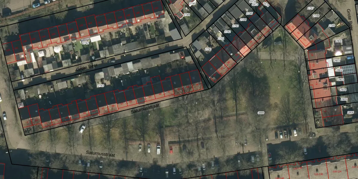 Het perceel waarop Saturnusstraat 45 staat heeft een oppervlakte van 2670 m². Dit is een zeer groot perceel. De perceeloppervlakte wordt geregistreerd door het Kadaster. Gedetailleerde informatie over de maten van dit perceel kunt u vinden in het rapport Kadastrale kaart met maatvoering van Saturnusstraat 45.