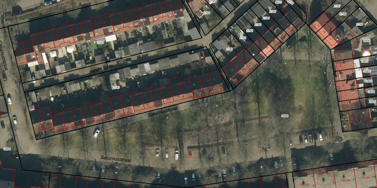 Het perceel waarop Saturnusstraat 47 staat heeft een oppervlakte van 2670 m². Dit is een zeer groot perceel. De perceeloppervlakte wordt geregistreerd door het Kadaster. Gedetailleerde informatie over de maten van dit perceel kunt u vinden in het rapport Kadastrale kaart met maatvoering van Saturnusstraat 47.