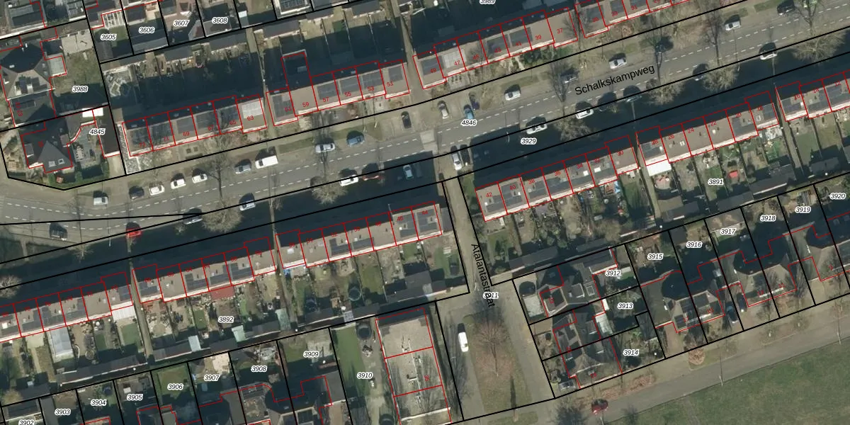 Het perceel waarop Schalkskampweg 44 staat heeft een oppervlakte van 3055 m². Dit is een zeer groot perceel. De perceeloppervlakte wordt geregistreerd door het Kadaster. Gedetailleerde informatie over de maten van dit perceel kunt u vinden in het rapport Kadastrale kaart met maatvoering van Schalkskampweg 44.