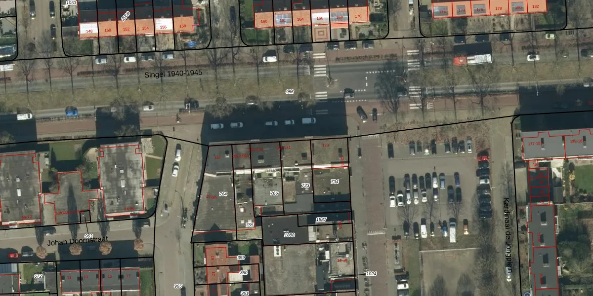 Het perceel waarop Singel 1940-1945 167 staat heeft een oppervlakte van 300 m². Dit is een groot perceel. De perceeloppervlakte wordt geregistreerd door het Kadaster. Gedetailleerde informatie over de maten van dit perceel kunt u vinden in het rapport Kadastrale kaart met maatvoering van Singel 1940-1945 167.