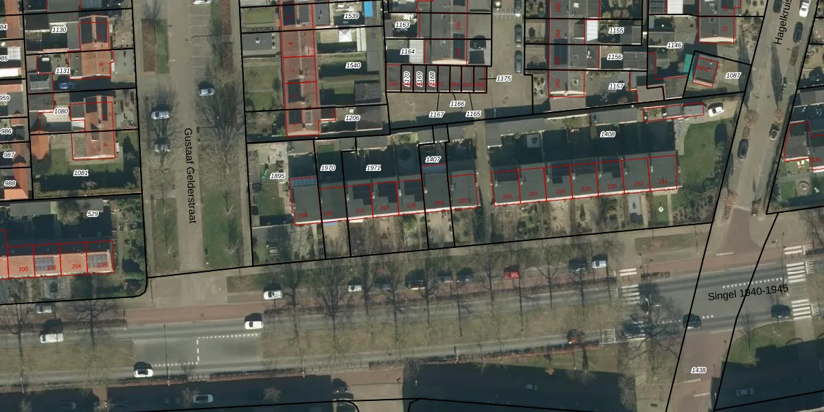 Het perceel waarop Singel 1940-1945 216 staat heeft een oppervlakte van 553 m². Dit is een groot perceel. De perceeloppervlakte wordt geregistreerd door het Kadaster. Gedetailleerde informatie over de maten van dit perceel kunt u vinden in het rapport Kadastrale kaart met maatvoering van Singel 1940-1945 216.