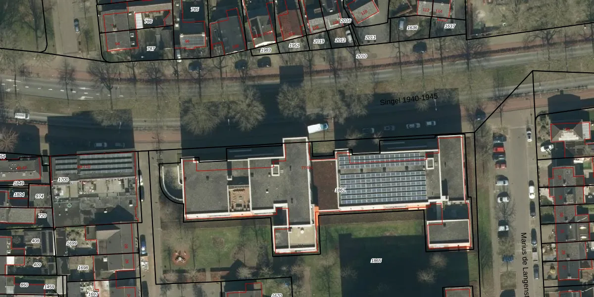 Het perceel waarop Singel 1940-1945 77-D staat heeft een oppervlakte van 2715 m². Dit is een zeer groot perceel. De perceeloppervlakte wordt geregistreerd door het Kadaster. Gedetailleerde informatie over de maten van dit perceel kunt u vinden in het rapport Kadastrale kaart met maatvoering van Singel 1940-1945 77-D.