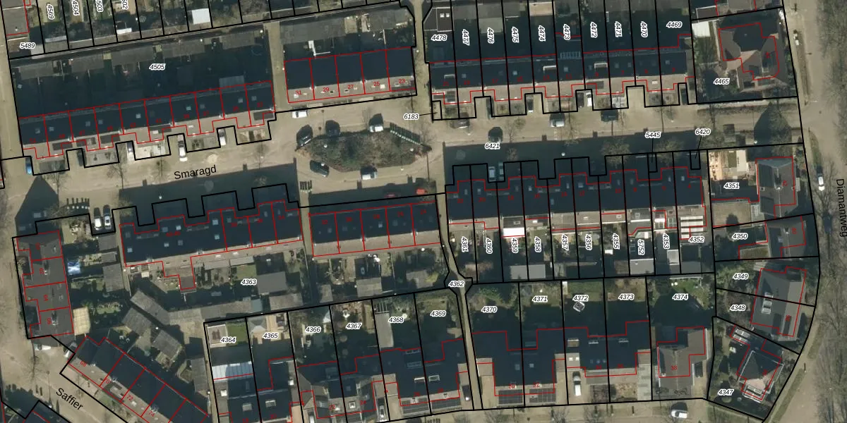 Het perceel waarop Smaragd 24 staat heeft een oppervlakte van 3380 m². Dit is een zeer groot perceel. De perceeloppervlakte wordt geregistreerd door het Kadaster. Gedetailleerde informatie over de maten van dit perceel kunt u vinden in het rapport Kadastrale kaart met maatvoering van Smaragd 24.