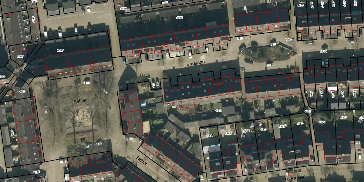 Het perceel waarop Smaragd 44 staat heeft een oppervlakte van 3380 m². Dit is een zeer groot perceel. De perceeloppervlakte wordt geregistreerd door het Kadaster. Gedetailleerde informatie over de maten van dit perceel kunt u vinden in het rapport Kadastrale kaart met maatvoering van Smaragd 44.