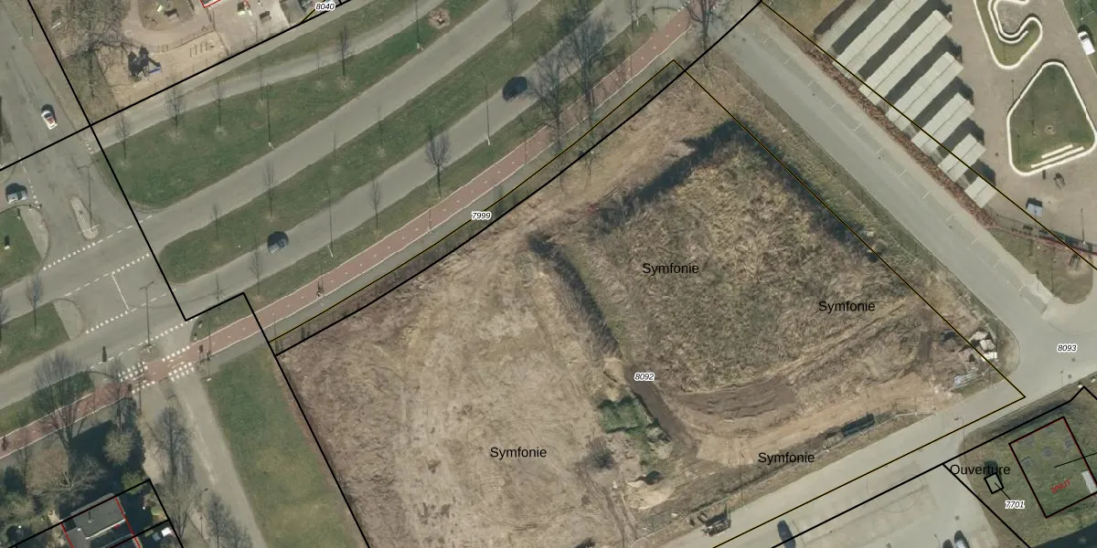 Het perceel waarop Symfonie 104 staat heeft een oppervlakte van 7636 m². Dit is een zeer groot perceel. De perceeloppervlakte wordt geregistreerd door het Kadaster. Gedetailleerde informatie over de maten van dit perceel kunt u vinden in het rapport Kadastrale kaart met maatvoering van Symfonie 104.