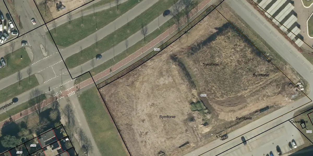 Het perceel waarop Symfonie 108 staat heeft een oppervlakte van 7636 m². Dit is een zeer groot perceel. De perceeloppervlakte wordt geregistreerd door het Kadaster. Gedetailleerde informatie over de maten van dit perceel kunt u vinden in het rapport Kadastrale kaart met maatvoering van Symfonie 108.