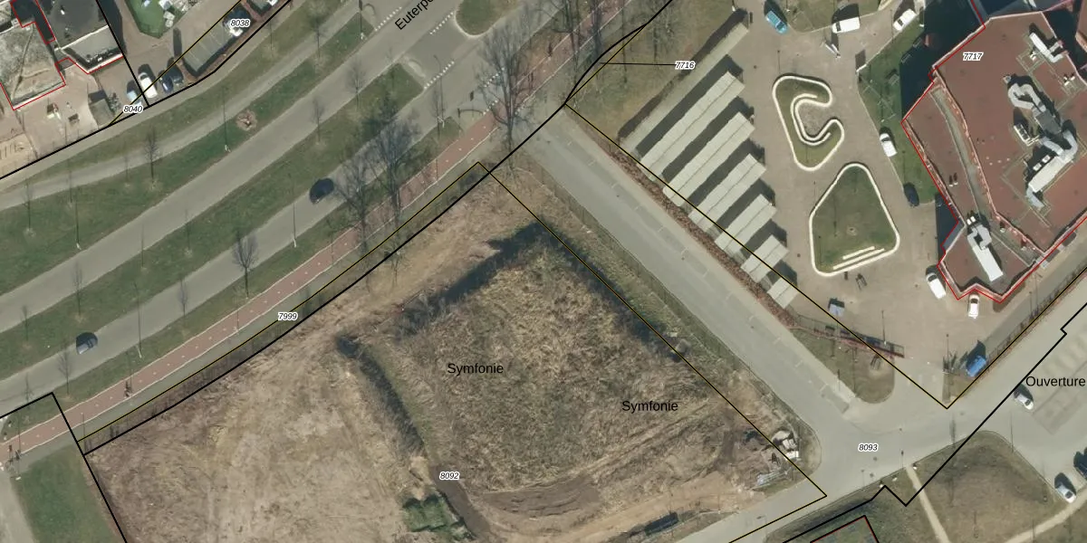 Het perceel waarop Symfonie 18 staat heeft een oppervlakte van 7636 m². Dit is een zeer groot perceel. De perceeloppervlakte wordt geregistreerd door het Kadaster. Gedetailleerde informatie over de maten van dit perceel kunt u vinden in het rapport Kadastrale kaart met maatvoering van Symfonie 18.