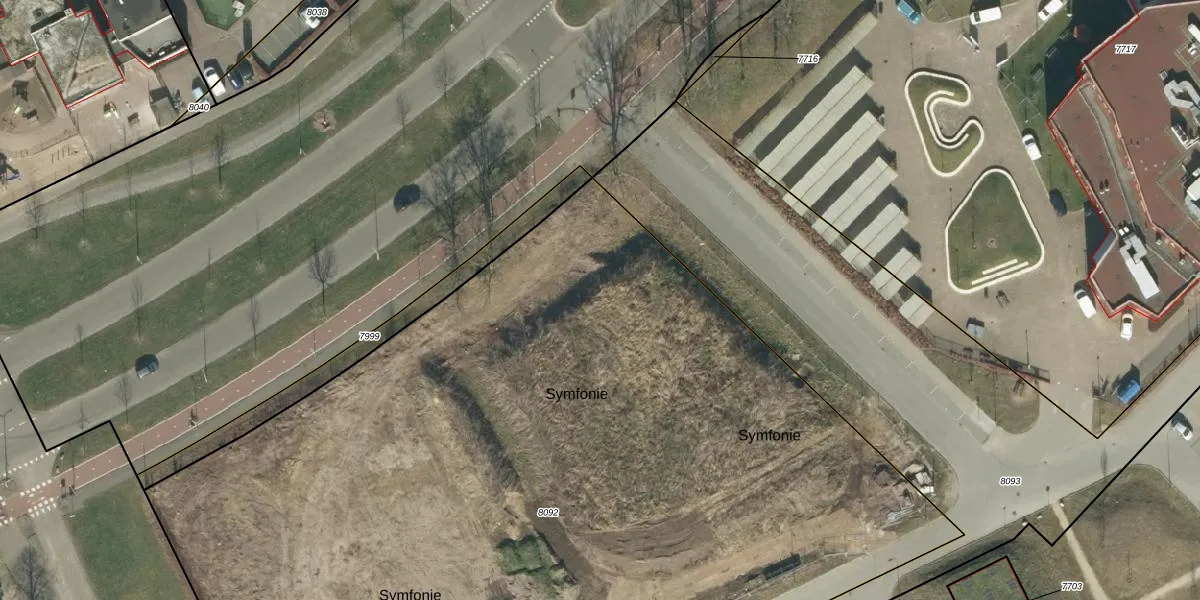 Het perceel waarop Symfonie 30 staat heeft een oppervlakte van 7636 m². Dit is een zeer groot perceel. De perceeloppervlakte wordt geregistreerd door het Kadaster. Gedetailleerde informatie over de maten van dit perceel kunt u vinden in het rapport Kadastrale kaart met maatvoering van Symfonie 30.