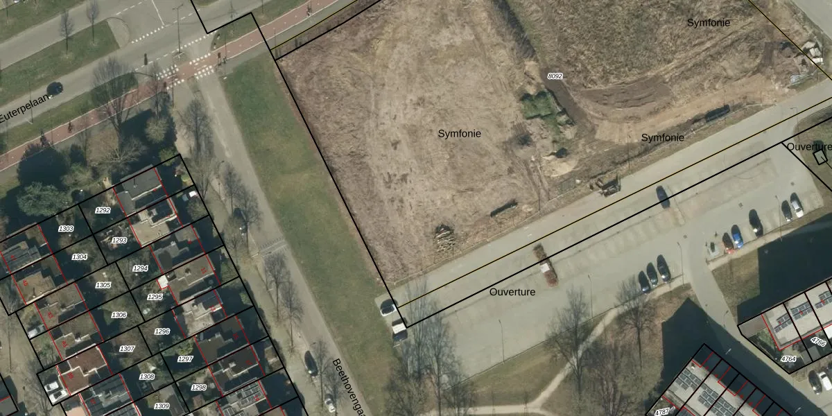 Het perceel waarop Symfonie 35 staat heeft een oppervlakte van 7636 m². Dit is een zeer groot perceel. De perceeloppervlakte wordt geregistreerd door het Kadaster. Gedetailleerde informatie over de maten van dit perceel kunt u vinden in het rapport Kadastrale kaart met maatvoering van Symfonie 35.
