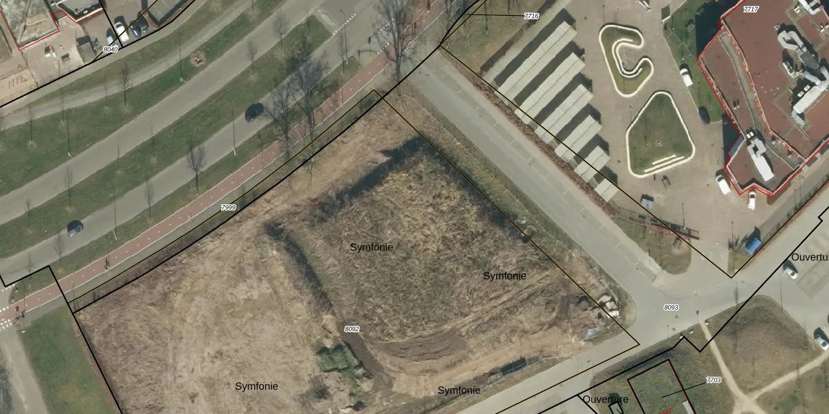 Het perceel waarop Symfonie 40 staat heeft een oppervlakte van 7636 m². Dit is een zeer groot perceel. De perceeloppervlakte wordt geregistreerd door het Kadaster. Gedetailleerde informatie over de maten van dit perceel kunt u vinden in het rapport Kadastrale kaart met maatvoering van Symfonie 40.