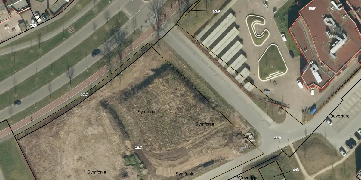 Het perceel waarop Symfonie 66 staat heeft een oppervlakte van 7636 m². Dit is een zeer groot perceel. De perceeloppervlakte wordt geregistreerd door het Kadaster. Gedetailleerde informatie over de maten van dit perceel kunt u vinden in het rapport Kadastrale kaart met maatvoering van Symfonie 66.