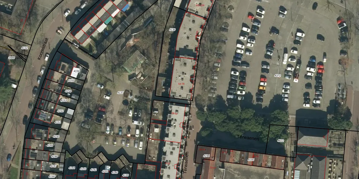 Het perceel waarop Terwaenen 62 staat heeft een oppervlakte van 1028 m². Dit is een zeer groot perceel. De perceeloppervlakte wordt geregistreerd door het Kadaster. Gedetailleerde informatie over de maten van dit perceel kunt u vinden in het rapport Kadastrale kaart met maatvoering van Terwaenen 62.