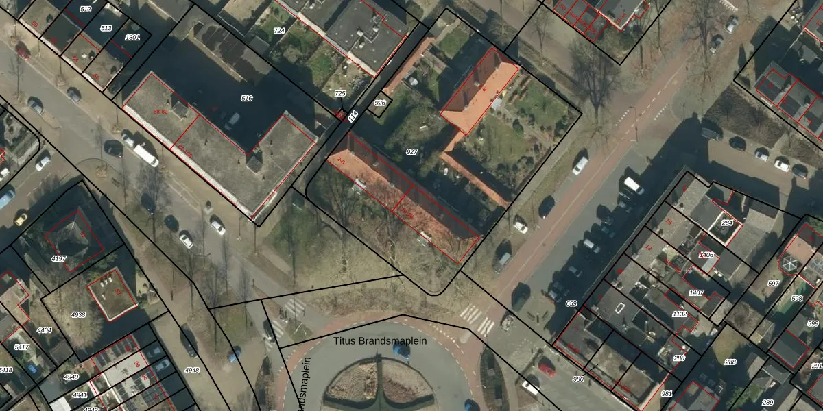 Het perceel waarop Titus Brandsmaplein 10 staat heeft een oppervlakte van 2381 m². Dit is een zeer groot perceel. De perceeloppervlakte wordt geregistreerd door het Kadaster. Gedetailleerde informatie over de maten van dit perceel kunt u vinden in het rapport Kadastrale kaart met maatvoering van Titus Brandsmaplein 10.