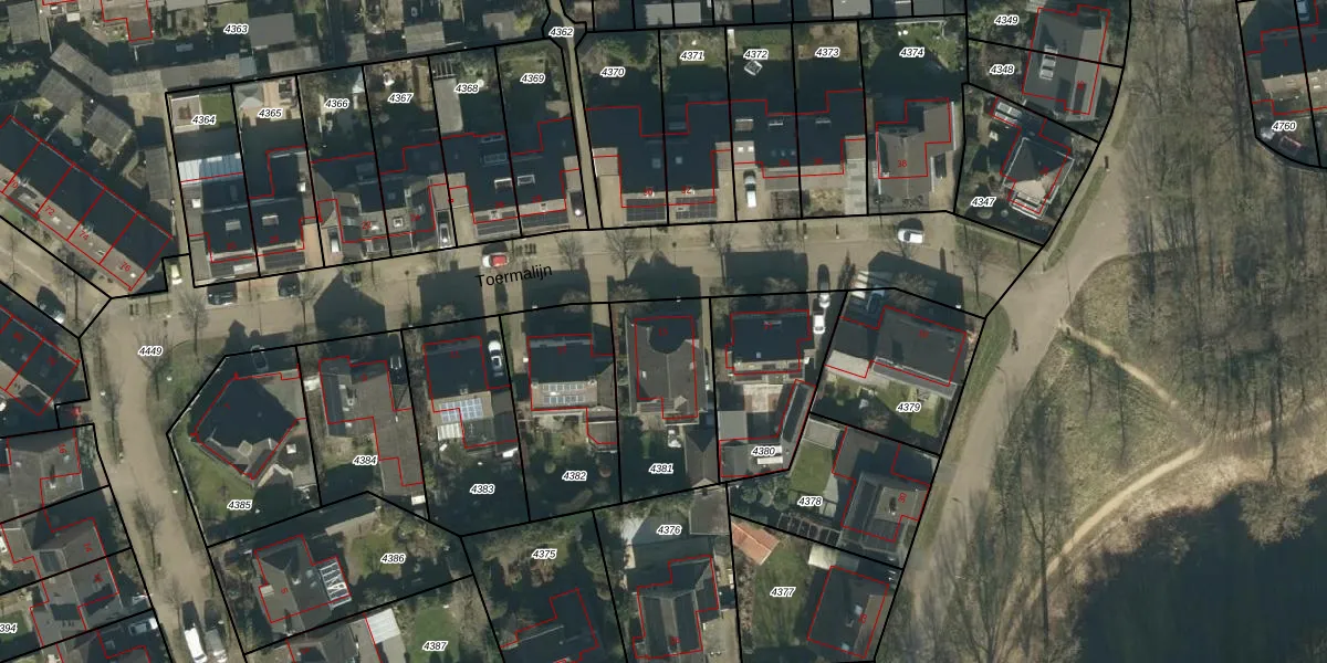 Het perceel waarop Toermalijn 15 staat heeft een oppervlakte van 441 m². Dit is een groot perceel. De perceeloppervlakte wordt geregistreerd door het Kadaster. Gedetailleerde informatie over de maten van dit perceel kunt u vinden in het rapport Kadastrale kaart met maatvoering van Toermalijn 15.